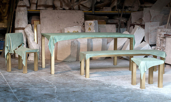 V italském Chianti v Toskánsku usídlený belgický designér Jens Praet vytváří už od roku 2007 experimentální série nábytku hraničící často s uměleckými díly. Tvoří převážně na zakázku nebo série vyrábí do galerií na své vlastní výstavy. Jeho poslední kolekcí nábytku má název Dressed neboli Oblečený. Obsahuje klasický stůl, lavici, stoličku a židli, které jsou překryty zeleně zoxidovaným bronzovým potahem tvarovaným do podoby kusu látky.