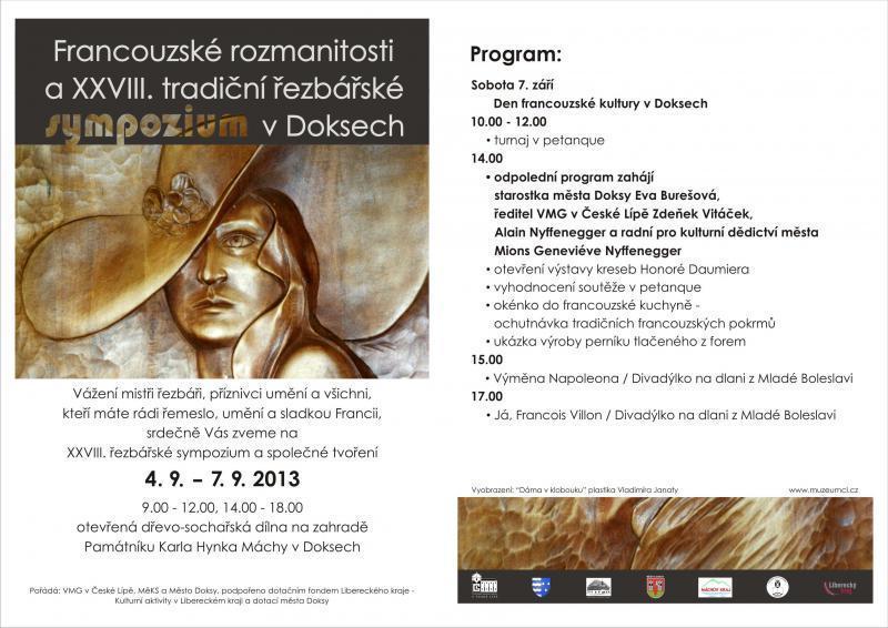 Den francouzské kultury se uskuteční v sobotu 7. září a jím také vyvrcholí několikadenní řezbářské sympozium. „Den francouzské kultury v Doksech zahájíme turnajem v pentanque, který je francouzským národním sportem. Turnaj se uskuteční na hřišti ZŠ K. H. Máchy v Doksech od 10 do 12 hodin. Ve 14 hodin zahájí odpolední program starostka města Doksy Eva Burešová, ředitel VMG v České Lípě Zdeněk Vitáček, Alain Nyffenegger a radní pro kulturní dědictví města Mions Geneviéve Nyffenegge,“ zve Jana Fridrichová.