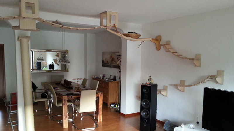 Truhlář uplatnil své řemeslo při tvorbě tohoto interiérového hřiště pro své kočky, které se doma určitě nenudí. Motivací k navržení tohoto systému byla hyperaktivní kočka, které nestačilo klasické škrabadlo ani další dostupné hračky na trhu. Truhlář měl zničené záclony, potahy i polštáře.