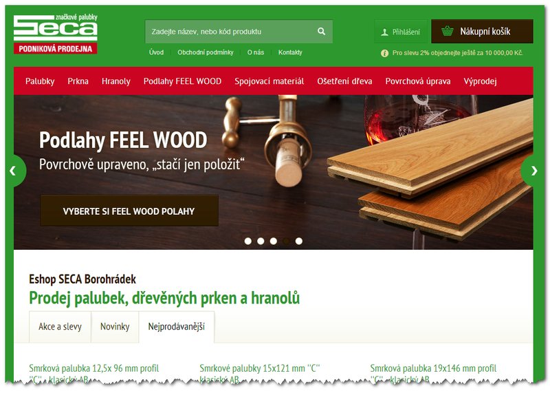 Nový eshop podnikové prodejny Vám nabízí široký sortiment dřevěných palubek, podlahovek, plotovek, latí a hranolů i masivní podlahy FeelWood! Ke všemu také příslušenství jako jsou příchytky, sponky, vruty, oleje, laky, barvy, lazůry a další.