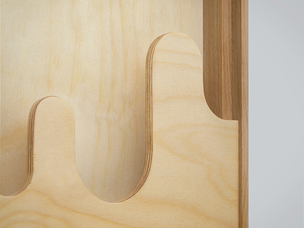 Detailní pohled na provedení věšáku - buk a březová překližka.