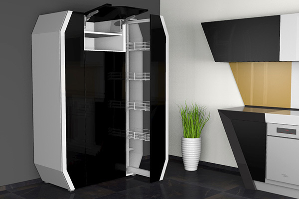 Otáčecí bar v zásadě umožňuje větší pohyblivost kuchyně a více prostoru v době, kdy kuchyň není využívaná. Kuchyňská dvířka jsou vyrobena z lakovaného MDF a pracovní deska z LG Hi-Mac akrylového smíšeného materiálu.