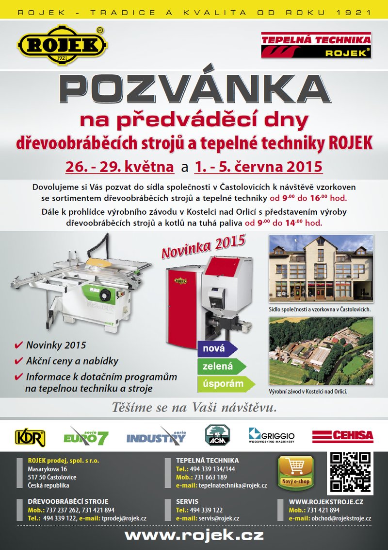 Dovolujeme si Vás pozvat na předváděcí dny dřevoobráběcích strojů a tepelné techniky společnosti ROJEK. Dále pak k prohlídce výrobního závodu v Kostelci nad Orlicí s představením výroby dřevoobráběcích strojů a kotlů na tuhá paliva. Předváděcí dny společnosti ROJEK se konají ve dnech 26. - 29. května a 1. - 5. června 2015 v Častolovicích.