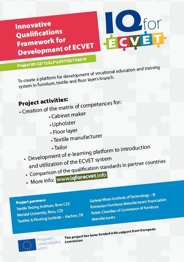 Cílem projektu Inovativní kvalifikační rámec pro rozvoj ECVET IQ pro ECVET CZ/13/LLP-LdV /TOI/134010 v rámci programu LEONARDO DA VINCI bylo aplikovat ECVET požadavky pro profese truhlář, čalouník, podlahář, krejčí a výrobce tkanin ve vytvořené matici kompetencí, dovedností a znalostí pro profese nábytkářského, dřevozpracujícího a textilního průmyslu, a to pro profese truhlář, čalouník a podlahář, výrobce textilií a krejčí v pěti jazykových mutacích, a to polštině, němčině, češtině, angličtině a rumunštině. Vytvořením matice přispěl zvýšení transparentnosti získaných kvalifikací a jejich vzájemné uznatelnosti v rámci zemí Evropské Unie.