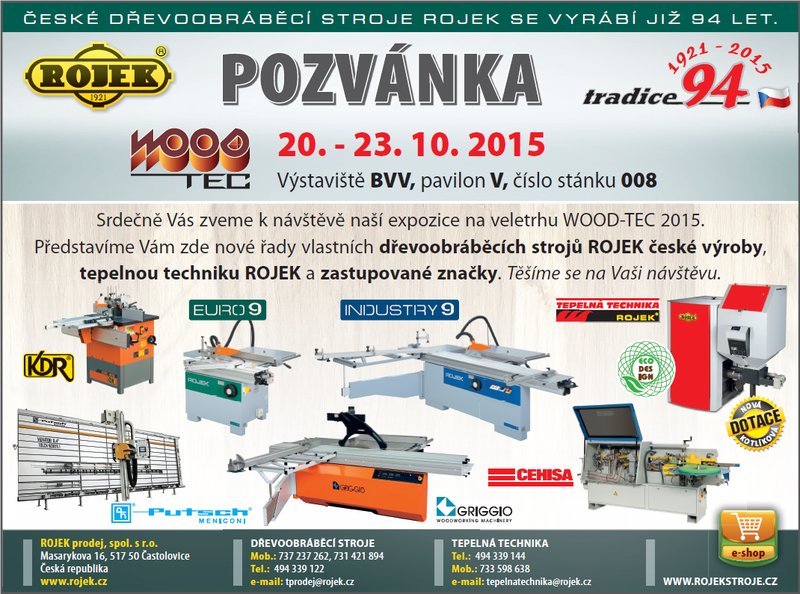 Společnost ROJEK - český výrobce dřevoobráběcích strojů a tepelné techniky si Vás dovoluje pozvat k návštěvě své expozice na veletrhu WOOD-TEC 2015. Výstaviště BVV, pavilon V, číslo stánku 008 - 20. - 23. 10. 2015.