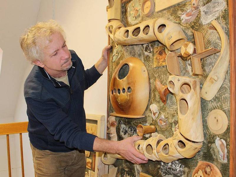 Jeho dřevěné obrazy jsou většinou abstraktní, proto je v kralupském muzeu vybavil, prý úplně poprvé, také průvodkami, které písemnou formou přibližují básníkův kreativní záměr.