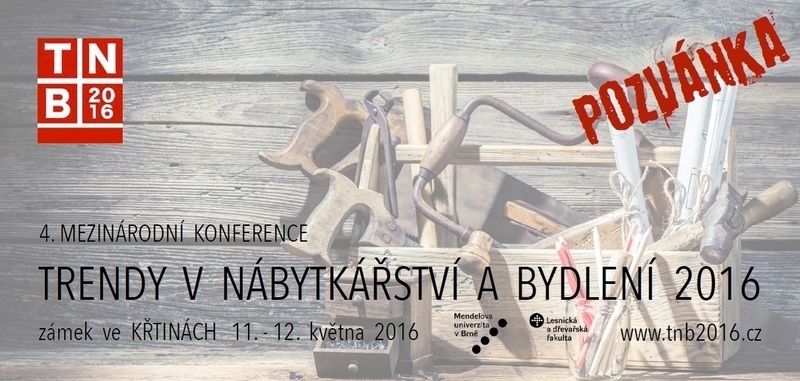 Lesnická a dřevařská fakulta Mendlovy univerzity v Brně, Ústav nábytku, designu a bydlení, zve odbornou veřejnost z oblasti tvorby a výroby nábytku na 4. ročník mezinárodní konference Trendy v nábytkářství a bydlení 2016, která se koná ve dnech 11.–12. května 2016 na zámku ve Křtinách, v prostředí Chráněné krajinné oblasti Moravský kras.