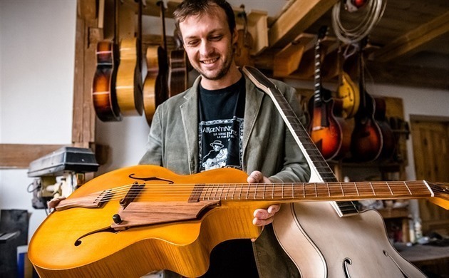 Na pracovní desce má Jan Fišer právě rozpracovanou jazzovou kytaru, kterou poveze do německého Frankfurtu na největší veletrh hudebních nástrojů. Zbývá ji jen nalakovat, opatřit strunami a naladit. Na stěně visí hotové nástroje různých velikostí i barev.