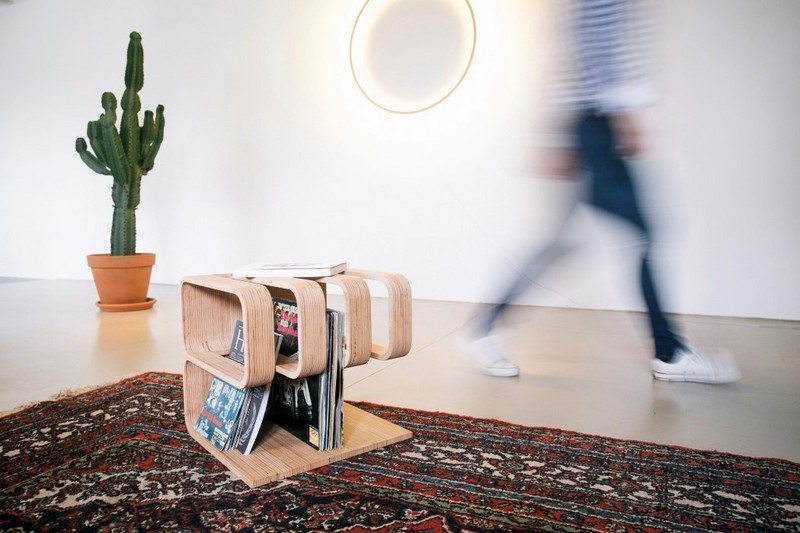 Dřevěný stolek od firmy Woodieful ze Slovinska je šikovně tvarovaný do písmene "e" (nebo "a" záleží na tom, jak se na něj díváte) lze použít jako konferenční stolek, stolička, stojan na časopisy, malá knihovnička či držák deštníků.