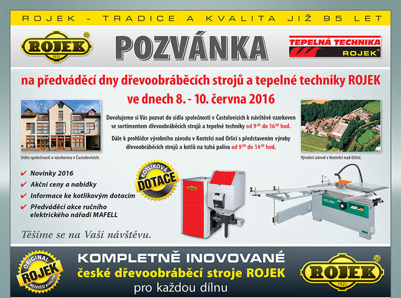 Dovolujeme si Vás pozvat na předváděcí dny dřevoobráběcích strojů a tepelné techniky společnosti ROJEK. Dále pak k prohlídce výrobního závodu v Kostelci nad Orlicí s představením výroby dřevoobráběcích strojů a kotlů na tuhá paliva. Předváděcí dny společnosti ROJEK se konají ve dnech 8. - 10. června 2016 v Častolovicích.