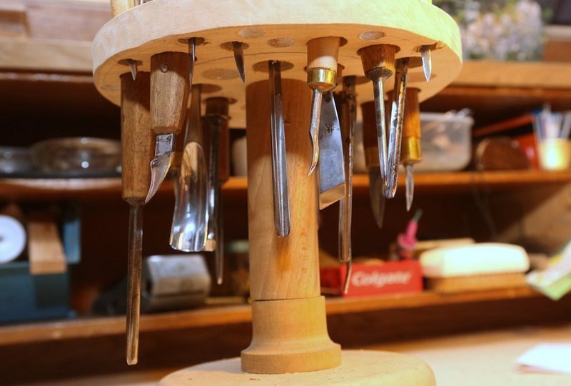 Na jeho pracovním stole leží nástroje prapodivných tvarů. Některé jsou jen tak pohozené, protože se před chvílí zarývaly do dřeva, jiné čekají ve stojanu, další desítky se schovávají v šuplíku. Na zemi jsou hoblinky a z reproduktorů hraje rádio.