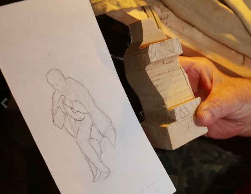 S návrhy a nápady přichází sám, někdy ale pracuje i podle obrázku či fotografie. Vše si nejprve nakreslí na papír, následně na špalek, který nahrubo ořeže. „A pak to přebytečné musí pryč. To je na tom to nejtěžší," říká a ukazuje zárodek další postavičky.