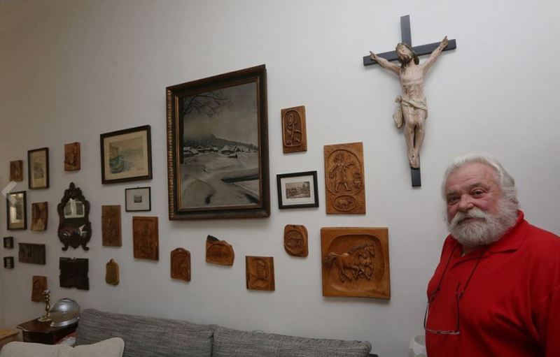 Jeho prvním počinem byl ozdobný rám na zrcadlo. Dodnes mu visí v obýváku. Vyřezal ho, když před čtyřiceti lety ležel v nemocnici. Kvůli zdravotním problémům musel nakonec ve svých třiceti letech do invalidního důchodu. Od té doby ve volném čase vyřezává.