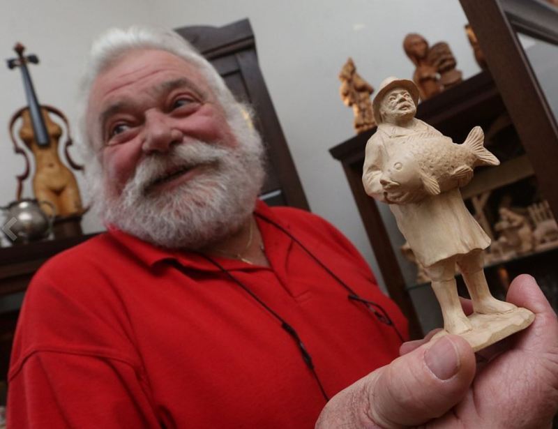 „Mám to támhle ve vitrínce. Snažil jsem se, ale dopadlo to katastrofálně," směje se a nesměle ukazuje postavičku rybáře s plnovousem. Pravdu ale nemá. Dřevěný mužík jako by mu z oka vypadl.