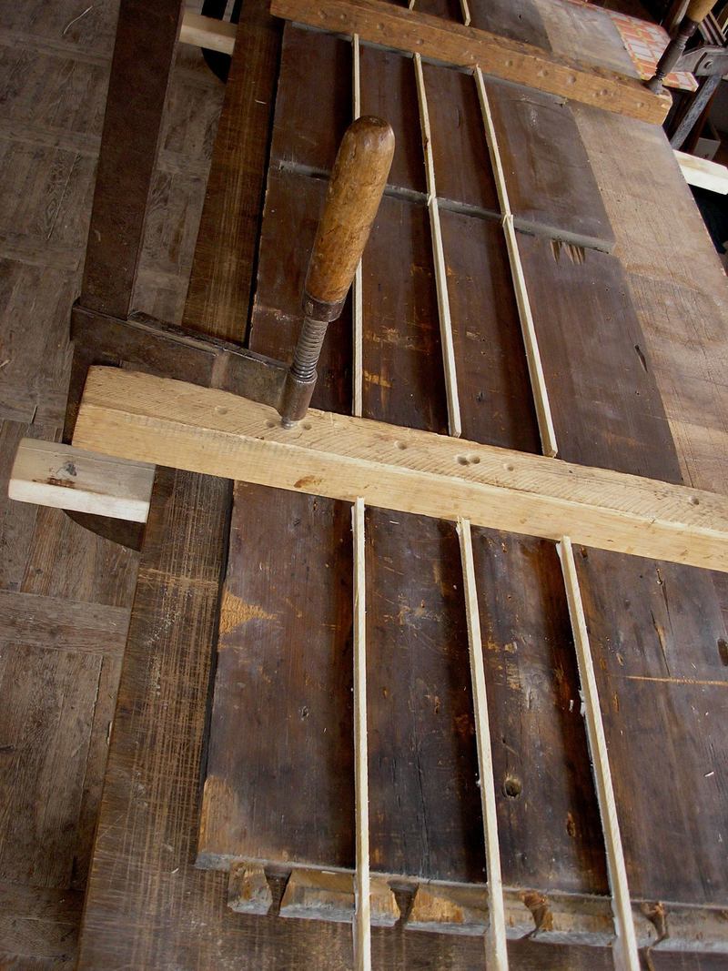 31/ Vypouklý bok je prořezaný, vložena špána, a svěrkami stažené do roviny, kdy se nechá lepidlo dobře vytvrdnout.