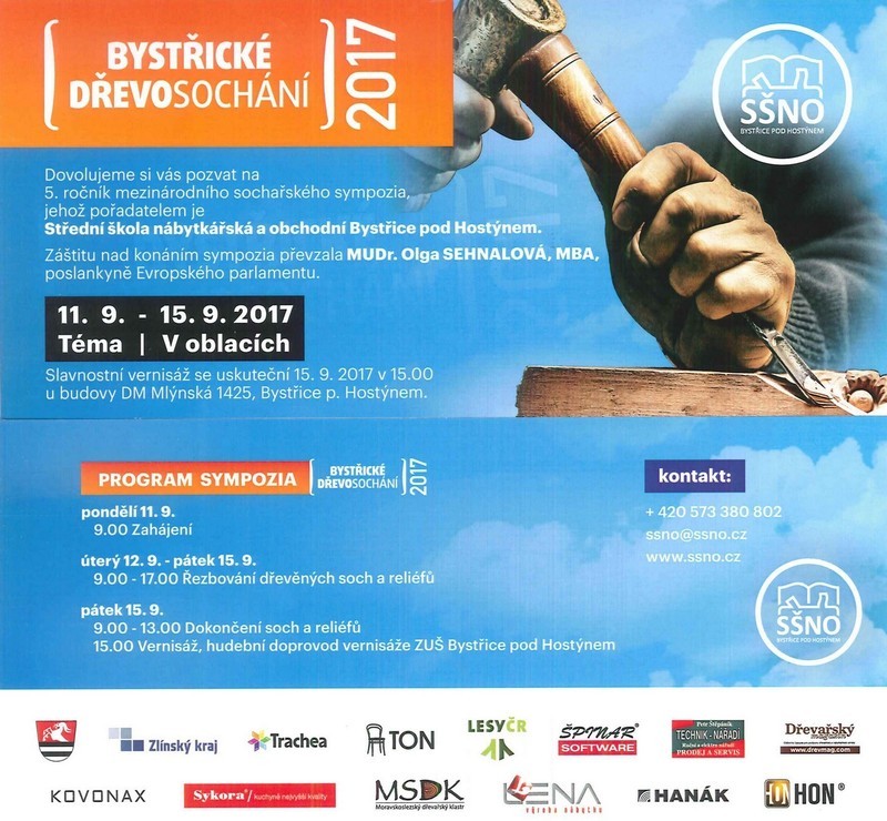 Střední škola nábytkářská a obchodní Bystřice pod Hostýnem pořádá 5. ročník MEZINÁRODNÍHO SOCHAŘSKÉHO SYMPOZIA. Letošní sympozium bude probíhat od 11. do 15. září 2017 a bude na téma V OBLACÍCH. Slavnostní vernisáž sympozia se uskuteční v pátek 15. září 2017 v 15.00 hodin u budovy Domu mládeže na Mlýnské ulici 1425.