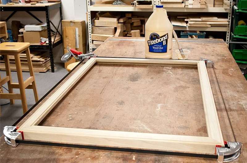 Po testu sestavení rámu odstraňte svěrku. Nyní aplikujte tenkou vrstvu lepidla Titebond II na obě spojované plochy, srovnejte rožky a vložte do stahovací svěrky, znovu upevněte rohové svěrky a stáhněte rám. Při utahování naviňte lano zpět směrem ke svěrce kvůli větší pevnosti na ploše.
