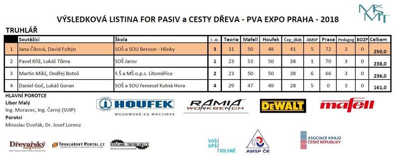 Ze čtyřech truhlářských týmů nejvíce zabodovala Jana Čiková a David Foltýn ze SOŠ a SOU Beroun – Hlinky, na druhém místě pak Pavel Kříž a Lukáš Tůma ze SOŠ Jarov. „První kolo ukázalo dobrou připravenost žáků druhých ročníků. Velmi schopně využili pily Mafell i širokopásovou brusku Houfek. Ukazuje se, že si budeme muset zvykat na fakt, že truhlářky dokáží být mnohdy šikovnější než mladí truhláři. V posledních třech ročnících to prokazují,“ uvedl hlavní porotce oboru truhlář Libor Malý.