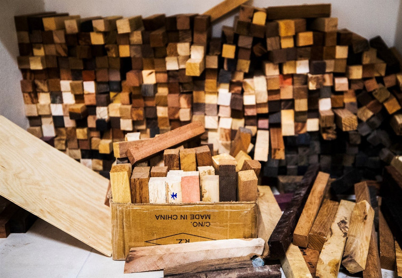 Dílnu si vybavoval postupně. Soustruh, vrtáky, řezačky, frézy, hodně dlát a hlavně spousta dřeva. Pro laika to na první pohled vypadá, jako když má Dominik Smrek ve výklenku pod falešným oknem naskládanou hromádku dřeva jako zásobu na chladnější měsíce. Jde ale o to nejdůležitější, co je k výrobě pera potřeba – špalíčky různého dřeva ze všech koutů světa.