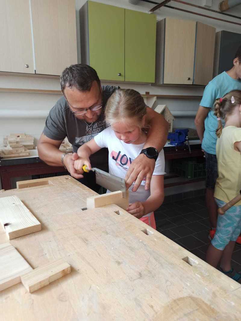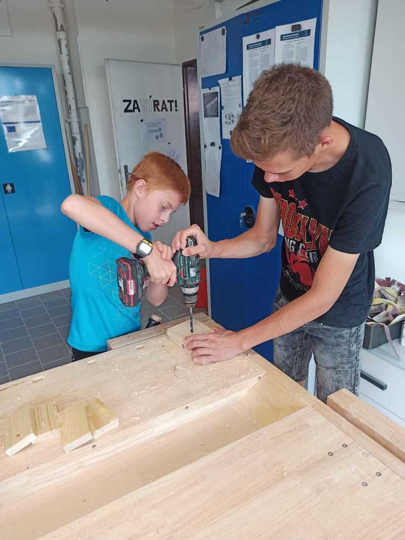 „Řezání, rašplování, broušení, vrtání, šroubování, frézování, tužka, metr, kladívko, hřebíky, rašple, dláto, záhlubník, AKU šroubovák, vrtáky, vruty, lepidlo na dřevo, brusný papír, čela, boky, mezistěny, sololit, masiv… To je jen výčet pojmů, v nichž se účastníci příměstského tábora, který je zaměřený na práci se dřevem, bravurně zorientovali! Máme tu prvňáčky až páťáky, každý také samozřejmě přišel s jinou úrovní znalostí a dovedností, ale bylo krásné sledovat, jak kluci i holky tu naši truhlařinu nasávali, jak se jim dosud neznámé stává samozřejmostí. Své roční zkušenosti jim předávali naši žáci, Vojtěch Pařil a Matěj Mikulica. Učni, a to teprve prváci, byli v rolích mistrů! Věkový rozdíl nebyl při práci v truhlářské dílně téměř znát, všichni chtěli odvádět co nejpreciznější práci. Velcí kluci byli dětem pomocníky, rádci, kamarády. To je pro nás, učitele, to největší ocenění naší práce, vychováváme si své nástupce,“ s úsměvem zhodnotil Pavel Dvořák, učitel odborných předmětů oboru Truhlář.