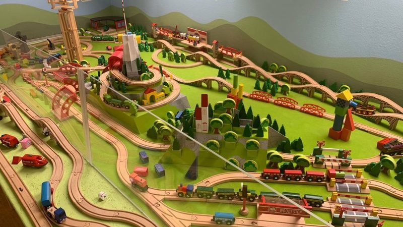 Je tu slyšet zvuk dřevěných vláčků na kolejnicích, část expozice určená k hraní. Za ní je část určená k dívání.