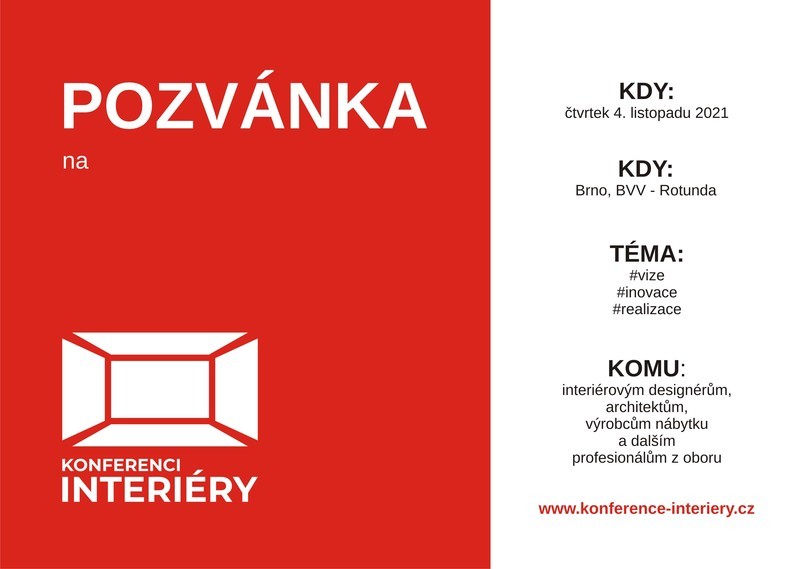 Ve čtvrtek 4. listopadu 2021 se koná jubilejní 10. ročník konference INTERIÉRY, která je určena interiérovým designérům, architektům, výrobcům nábytku a dalším profesionálům z oboru interiérů. Akce bude probíhat v Brně, na BVV v přednáškovém sále Rotunda, který má úžasnou atmosféru. Program přednášek je již znám a těšit se můžete na mnoho zajímavých témat, která mají posluchače posunout v kreativním myšlení a k inovacím, dodat odvahu k úžasným realizacím a uskutečnění svých vizí.