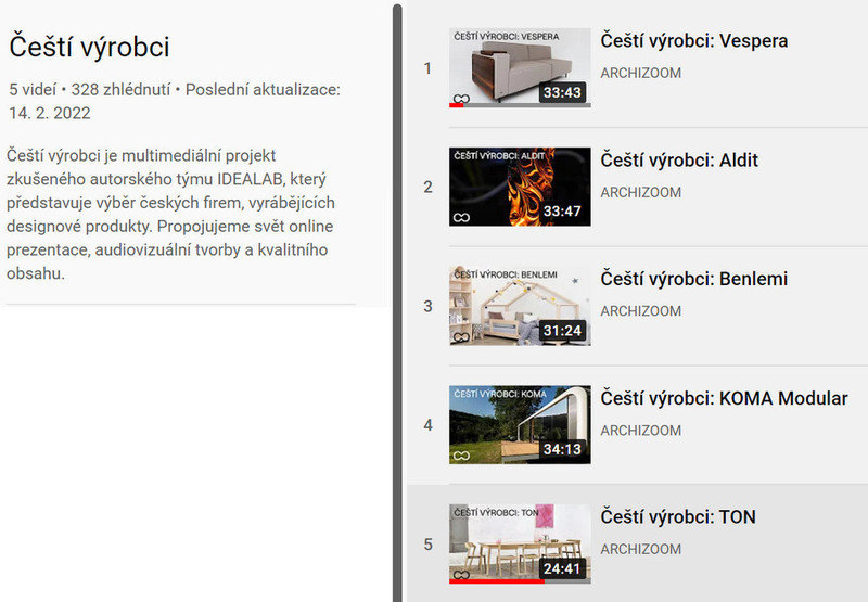 Premiérový díl Čeští výrobci představil značku TON, českého výrobce ohýbaného nábytku. Projekt vznikl za podpory ministerstva zahraničních věcí.