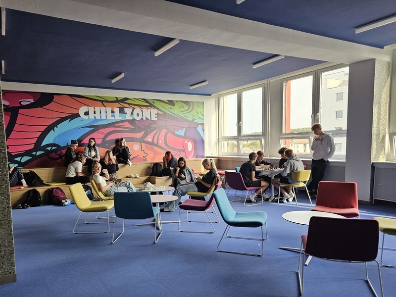„Když jsem chill zónu poprvé uviděl, zůstal jsem stát v němém úžasu. Barevné, pohodlné židle se skvěle laděnými stolečky a modrým kobercem. Na jedné straně velká dřevěná lavice na sezení i ležení, naproti ní vypolstrovaná červená sedačka, kde mám už svoje místečko,“ svěřil se Vladimír Pánek, žák 2. ročníku nástavbového studia.