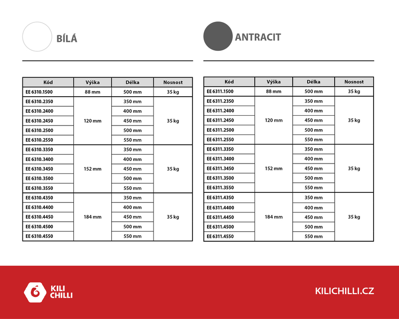 Systém Kili CHILLI box nabízí širokou škálu délek a šířek. Díky tomu je tento zásuvkový systém flexibilní a lze jej použít v různých typech nábytku, ať už jde o velké kuchyňské linky, obývací skříně, nebo komody. Rozměrová flexibilita je jedním z hlavních důvodů, proč jsou tyto zásuvky oblíbené jak u truhlářů, tak u výrobců sériového nábytku. Systém se vyrábí ve výškách 88, 120, 152 a 184 mm a v délkách 300 – 550 mm.