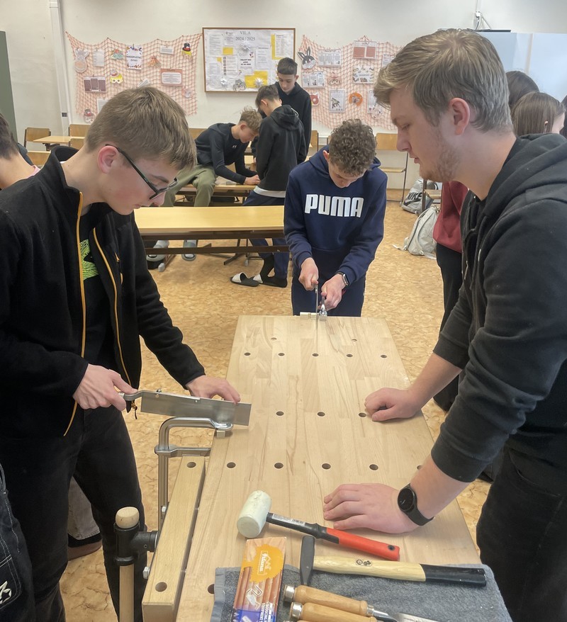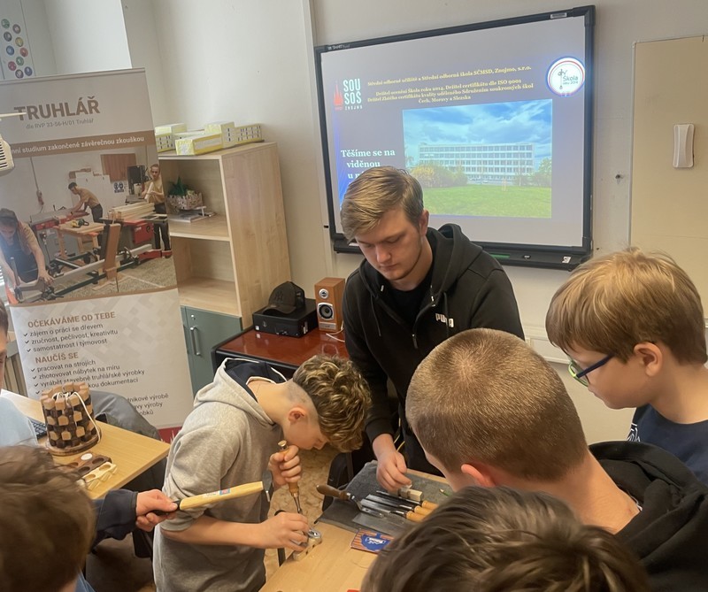 Prezentace praktických dovedností, jedna z mnoha aktivit, které SOU a SOŠ SČMSD, Znojmo, s.r.o. nabízí. Středoškoláci představují své obory a předávají své praktické dovednosti žákům základních škol. 27. únor 2025 patřil truhlářům a tématu Poznávání dřevin…