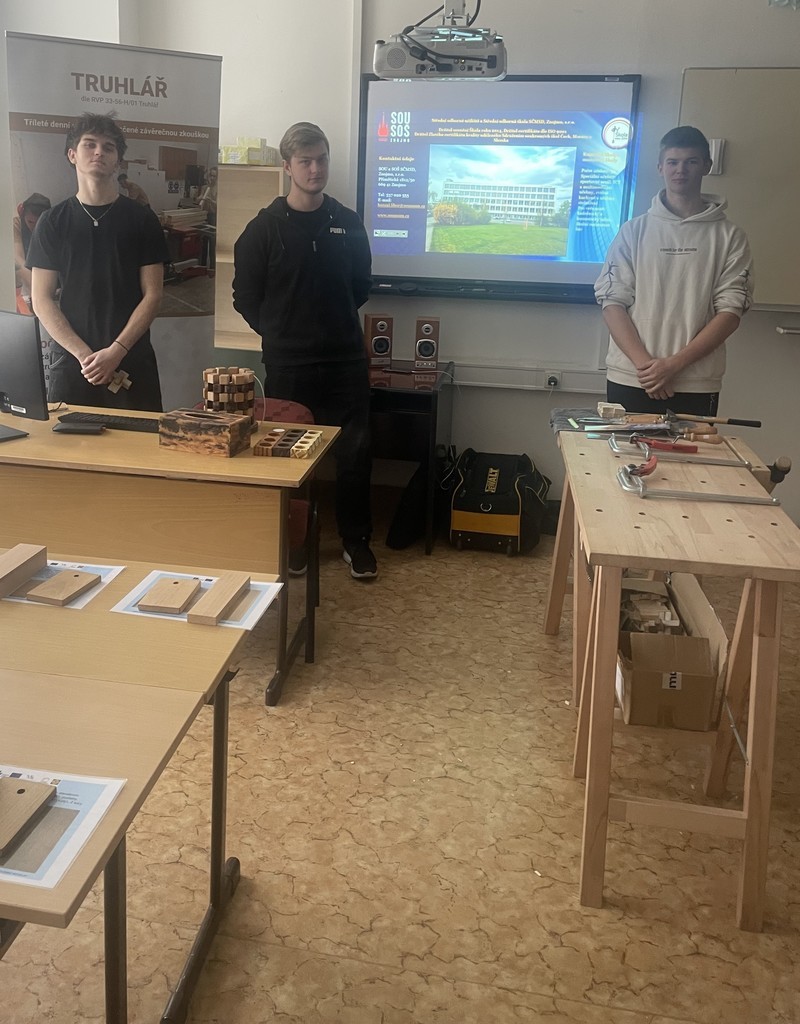 „Máš vztah k přírodě? Chceš se naučit poznávat všechny stromy a druhy dřev? Láká tě jejich vůně? Pilka, hoblík, rašple, palička, dláto či štětec patří mezi tvé oblíbené nářadí? Baví tě nejen práce manuální, ale i s chytrými stroji a programy, mezi něž patří například AutoCAD? Chceš mít školu jen týden a ten druhý být na praxi? Tak pro tebe je tím pravým ořechovým náš tříletý učební obor Truhlář! Uplatní se v něm všichni, kdo mají kreativní nadání, a to nejen chlapci, ale i dívky,“ představili obor Jakub Kuba a Lukáš Polášek, žáci TR2.A.