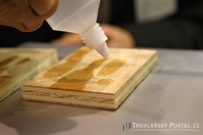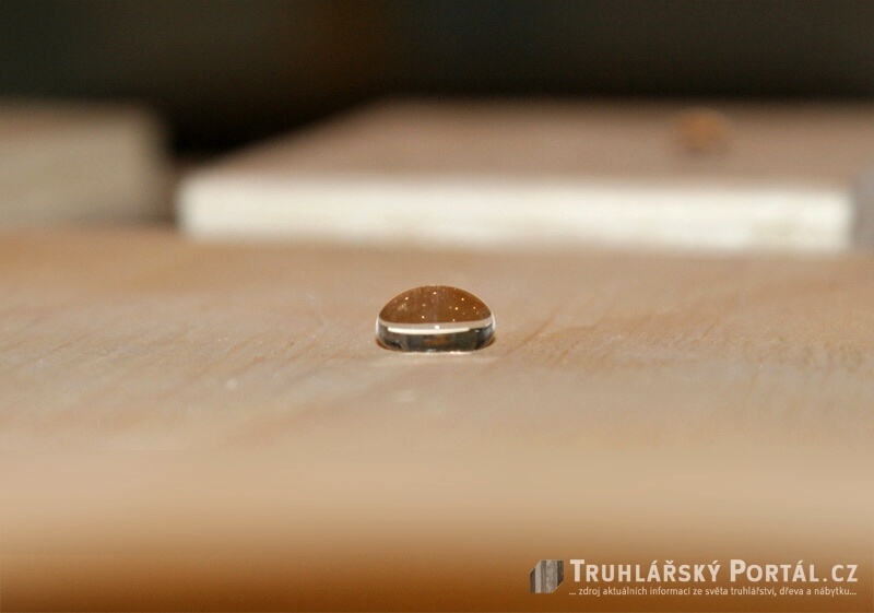 Chování kapky na povrchu dřeva, které bylo vystaveno působení plazmatu s přísadou. Důkaz naprosté odolnosti proti vodě.