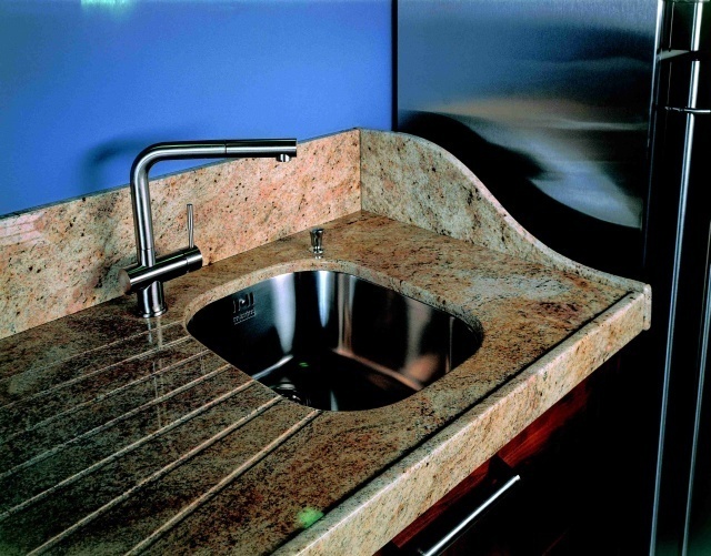 Žula nabízí i možnost volby, pokud jde o řešení mycího prostoru. Dřezy lze nejen tradičně vsazovat shora, jak bývá zvykem, ale lze je montovat i zespodu – jsou hlubší a při tomto řešení vycházejí pořizovací náklady často i levněji. Přímo do žuly je možné zhotovit leštěné odkapní plochy, ať již rovné nebo vyspádované, včetně leštěných drážek pro odvádění vody do dřezu.