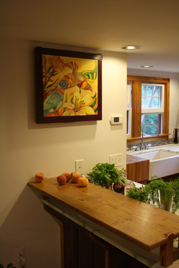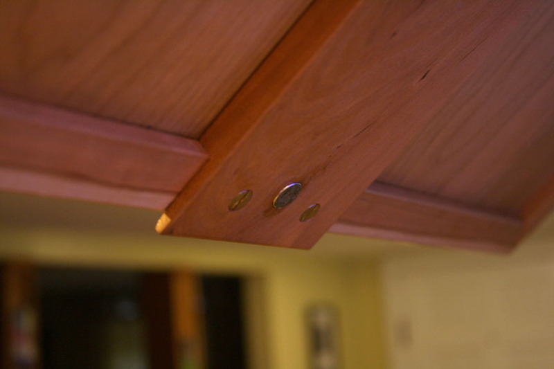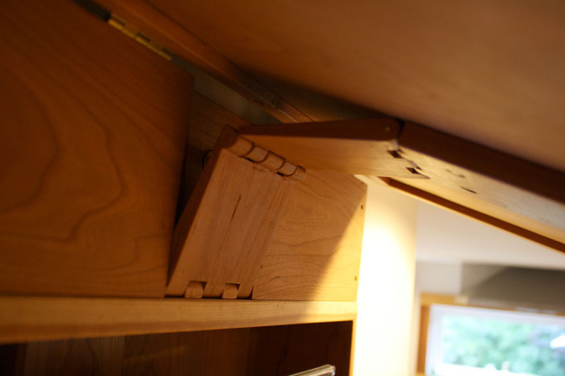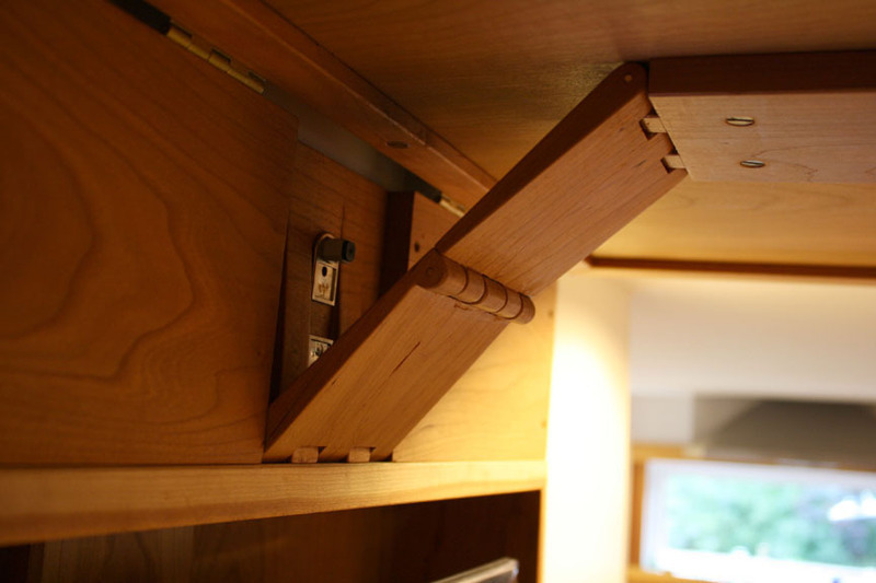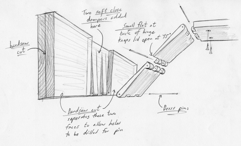 Způsob vyklápění dvířek "víka" s obrazem se dá řešit různými způsoby. Na obrázcích uvadíme zajímavou ukázku výklopného systému, kdy truhlář použil nábytkové panty vlastní výroby, ale samozřejmě se dá využít i klasické výklopné kování od známých firem jako je Blum (Aventos), Hettich (Lift Advanced), Häfele (Smuso) a dalších.