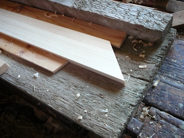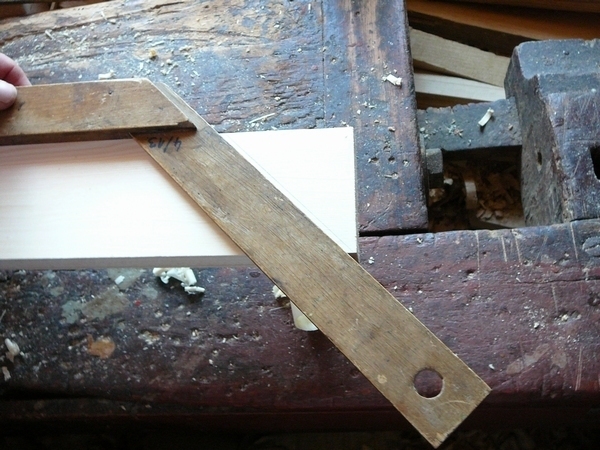 6. Následuje výroba obložek. Připravíme si prkna a ohoblujeme je. Vyměříme potřebnou délku. Pak úhelníkem vyznačíme úhel 45°, ve kterém budou napojená k sobě a zařízneme je na obou koncích. Řezy začistíme hoblíkem.