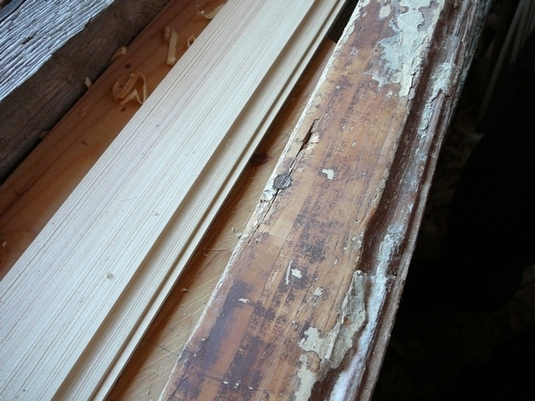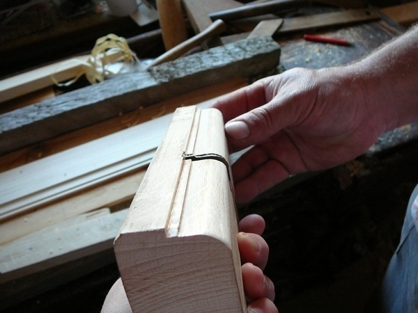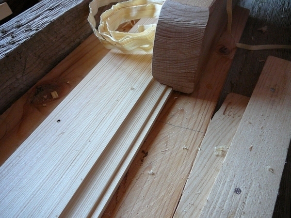 7. Obložky jsou ozdobené profilem na vnější straně. Ten se vytvoří pomocí profilového hoblíku na delší straně prkna. Na fotografii vpravo je pro srovnání původní a nová obložka.