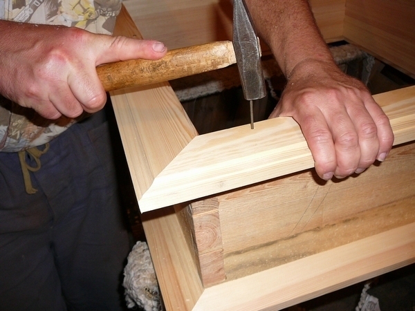 8. Nakonec je potřeba obložky na špaletu správně napasovat. Nejprve se zkusmo přichytí jedním hřebíkem a po potřebném srovnání se opět sejmou, vnější polovina šířky hrany špalety se namaže lepidlem, obložky se opět nasadí a přitlučou hřebíky (zde kovovými, lze použít i dřevěné). Obložka nemůže být připevněná zároveň s vnitřní hranou špalety, musí se nechat místo na falc okenního křídla.