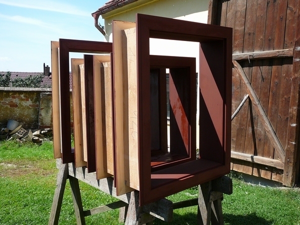 Hotové špalety opatřené nátěrem. Budou do stavby zasazené spolu s roubením.