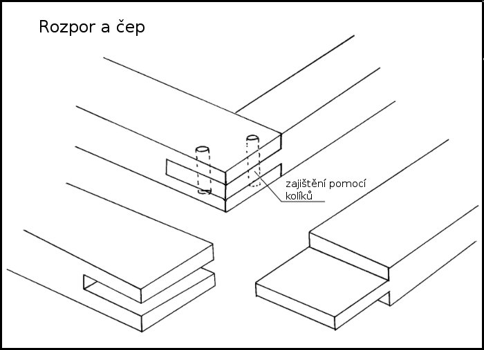 Spoj lepený i nelepený. Používá se ke spojování pravoúhlých rámů, hlavně u dveří, oken a nábytkových dvířek. Na jednom dílu je v místě spojení odstraněna prostřední třetina šířky prkna (rozpor), na protilehlém dílu naopak obě třetiny vnější, zatímco ta prostřední se ponechá. Tím vznikne čep k zasunutí do rozporu. Spoj se obvykle lepí, může se zajistit kolíkem.