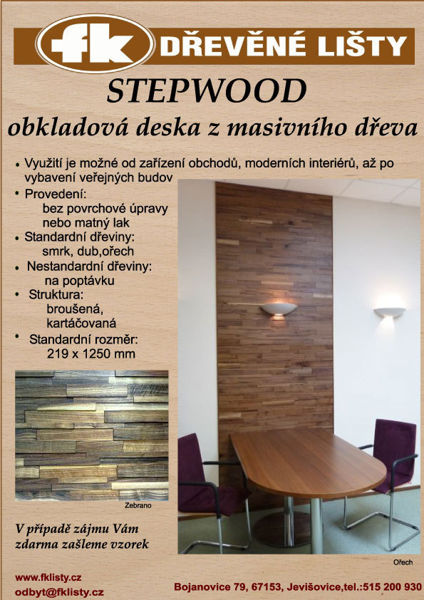 Novinkou v expozici firmy FK dřevěné lišty, spol. s r.o. Bojanovice budou dřevěné 3D obkladové desky – STEPWOOD. Nová dřevěná obkladová deska s 3D efektem je určená do moderních interiérů. Jde o kreativní pracovní materiál pro architekty, designéry a truhláře. Vysoká kvalita dřeva a přírodní vzhled umožňují použití obkladové desky Stepwood prakticky všude, od zařízení obchodů přes moderní interiéry až po vybavování veřejných prostor. Povrchovou dekorační vrstvu tvoří dřevěné lamely šířky 15, 27 a 45 mm s tloušťkou 3, 4,5 a 6 mm, povrch lamel je broušený nebo kartáčovaný, povrchová úprava lakování matným lakem. Desky se vyrábějí v rozměru 219 mm x 1250 mm (1 kus = 0,274m2) v tloušťce od 10 mm do 13 mm ze standardní dřeviny – smrk, dub, ořech, jiné na poptávku. Při rovné a hladké stěně lze desku nalepit přímo na stěnu. Může se také upevnit pomocí spon na vyrovnávací montážní lišty - svisle upevněné dřevěné latě vyrovnají nerovnosti. Na tyto latě se desky upevňují pomocí speciálních spon díky drážkám, které jsou vyfrézovány po obvodu desek.