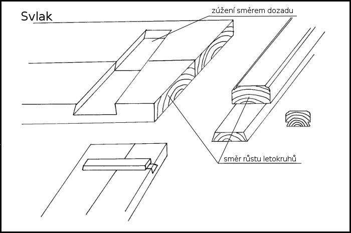 4. Nyní si připravíme hranol, ze kterého vyrobíme samotný svlak. Je o něco delší, než budoucí svlak, od předu do zadu se zužuje stejně jako lišta použitá k zářezům svlakového lože. Je nutné dbát na směr růstu letokruhů, viz nákres. Pomocí hoblíku svlakovníku z obou bočních stran vyhoblujeme drážky. Ubíráme materiál tak dlouho, dokud se svlak nedá částečně zasunout do lože (zhruba do jedné třetiny).