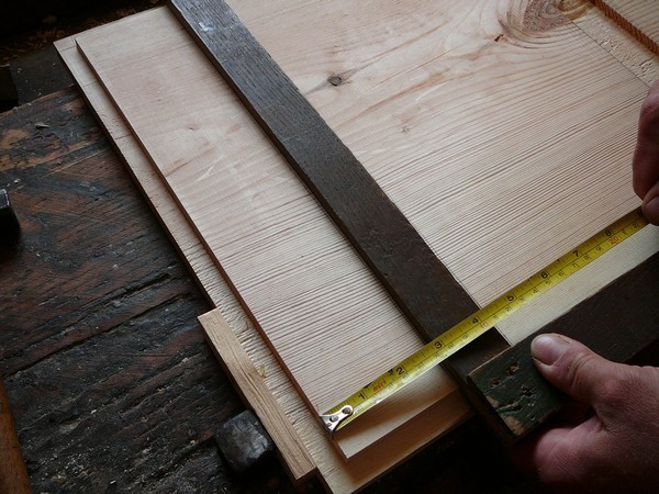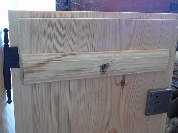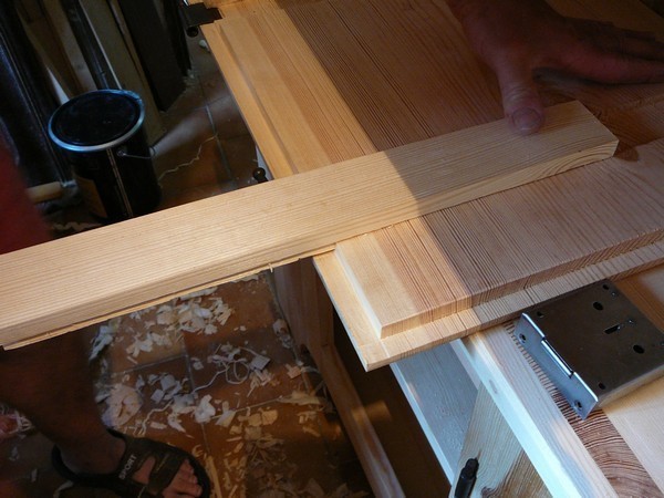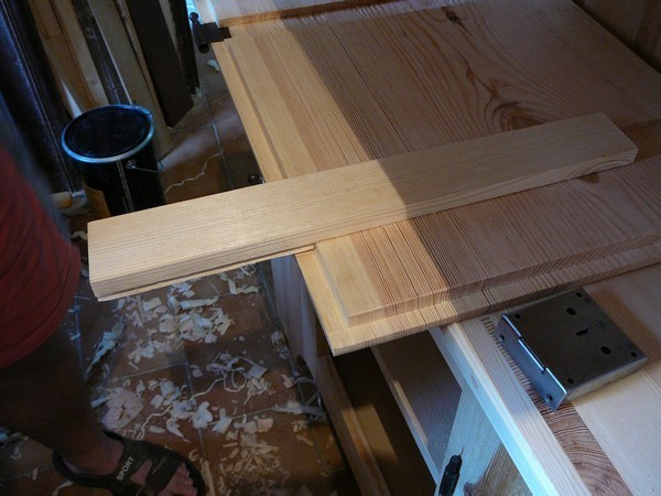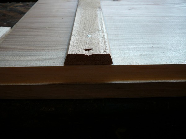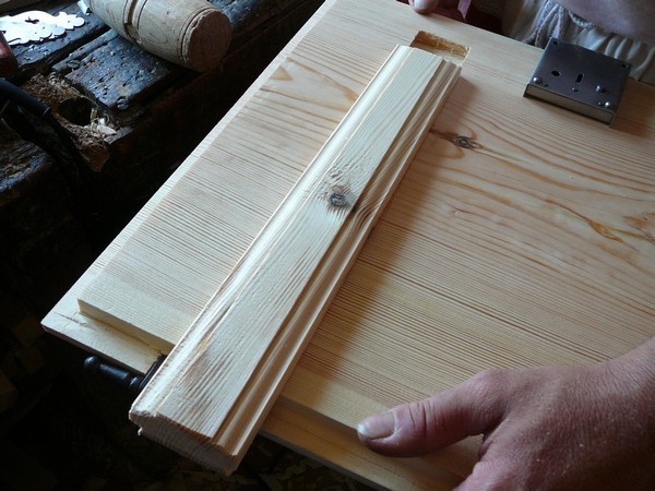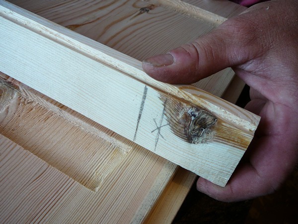 1. Začneme vytvořením svlakového lože na zadní straně dvířek. Svlaky budou dva, horní a dolní. Oba se vyrábí stejně. Pomocí pravoúhlého pravítka si vyměříme místo budoucího svlakového lože a narýsujeme dvě rovnoběžky vzdálené od sebe jeho šířku. Mezi přímky pak přiložíme připravenou lať. Ta je na jedné straně o několik mm širší, touto širší stranou ji přiložíme na stranu dvířek, kde budou závěsy. Na druhém konci lať vycentrujeme na střed obou rovnoběžek. Boční okraje latě jsou zkosené ve stejném úhlu jako drážka na svlakovníku, který budeme používat. Lať se přitluče hřebíky.