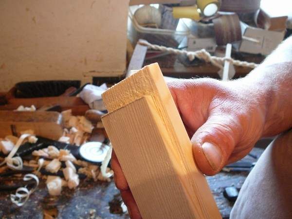 8. Vytvoříme ozdobné zakončení. Z horní části konce šikmo zahoblujeme a řezné plochy začistíme hoblíkem.