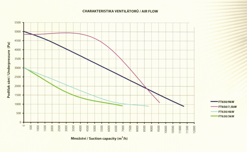 Odsávací zařízení jsou vybavena ventilátory moderní konstrukce, což se projevuje v nízké provozní hlučnosti a snížené energetické náročnosti. V závislosti na odsávací kapacitě jsou jednotky osazeny motory s výkony 3 kW, 4 kW, 7,5 kW nebo 9 kW. Samozřejmostí je možnost dovybavit zařízení otáčecí hlavou pro napojení hadice k CNC stroji a motorickým oklepem filtru.