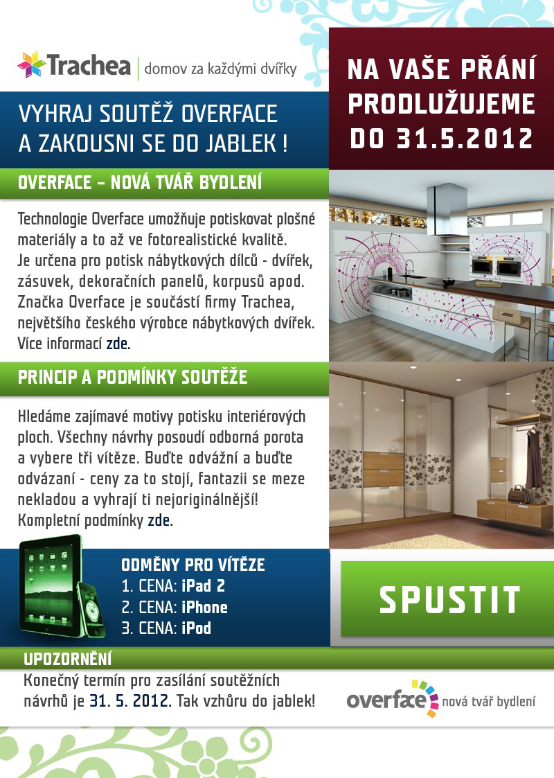 Hledáme nové a originální nápady na motivy nábytkových potisků Overface. Odměny pro vítěze: 1. cena: iPad 2 2. cena: iPhone 3. cena: iPod