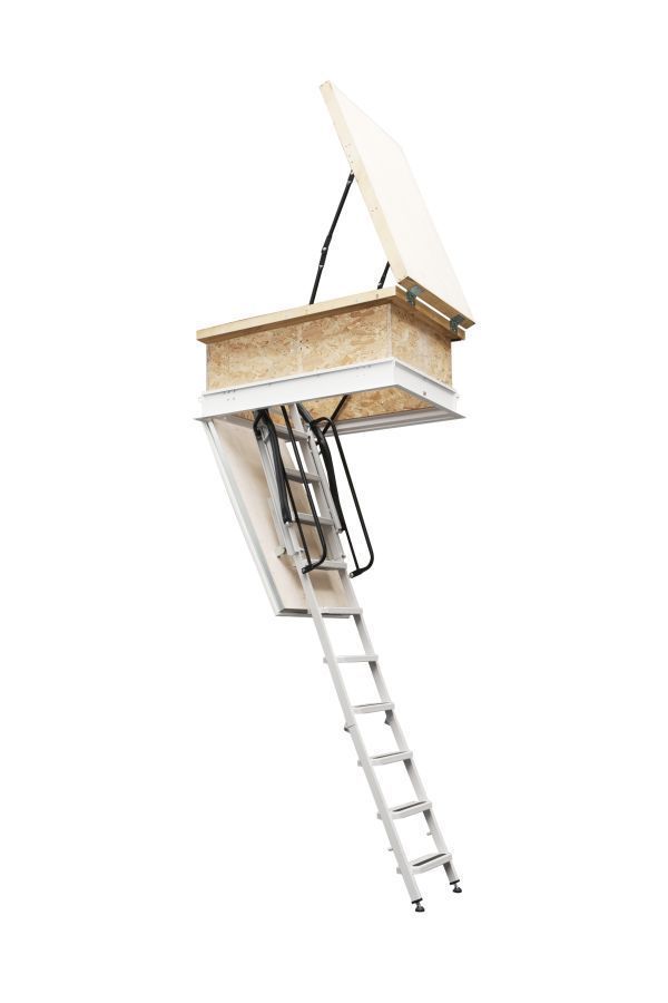 Schodiště ARISTO PP - Schody s plechovým sendvičovým víkem zabudované do stropu. Uvnitř víka je tepelná a protipožární izolace. Spára mezi víkem a rámem je těsněná protipožární zpěňovací páskou. Na konstrukci rámu je upevněn skládací žebřík spojený s