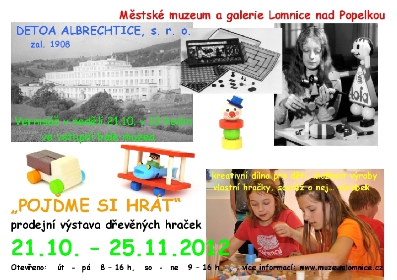 Tentokrát půjde o přehlídku nepřeberného množství produkce firmy Detoa Albrechtice s. r. o. (zal. 1908), která se výhradně zaměřila na výrobu tradičních dřevěných hraček jak s prvorepublikovými motivy, tak i současnými moderními trendy. Pro zájemce bude připraven velký sortiment hraček, který se tak může stát vhodnou inspirací k nákupu vánočních dárků. Kromě toho mohou děti využít návštěvy kreativní dílny, kde je pro ně připravena možnost vyrobit si vlastní hračku dle své fantazie. Nejlepší výrobek bude oceněn zajímavou výhrou v rámci soutěže, kterou vyhlásila firma Detoa. Výstava se koná od 21. října do 25. listopadu a zahájena bude slavnostní vernisáží v neděli 21. 10. v 10 hodin ve vstupní hale muzea.