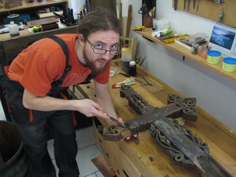 Ondřej Mour při restaurování kříže