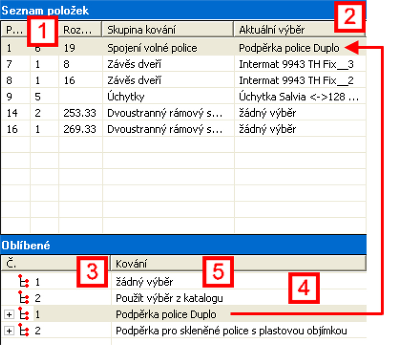 Ukázka výběru jednotlivých komponent ze seznamu obl ...