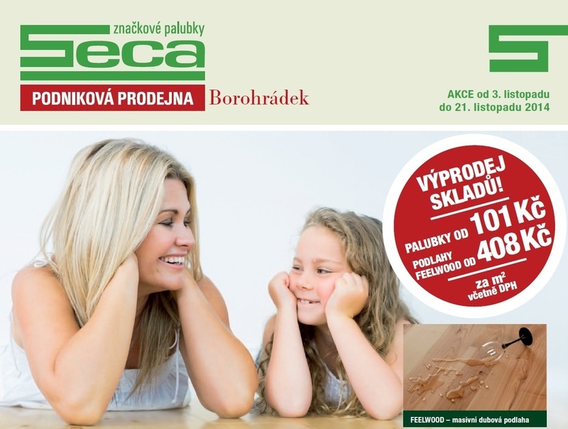 Začíná listopadový výprodej skladů v podnikové prodejně v Borohrádku. Palubky od 101 Kč a vybrané masivní podlahy FeelWood od 408 Kč, včetně povrchové úpravy. Na zadní straně letáku tradičně naleznete prodej celého množství se slevou až 50 %.